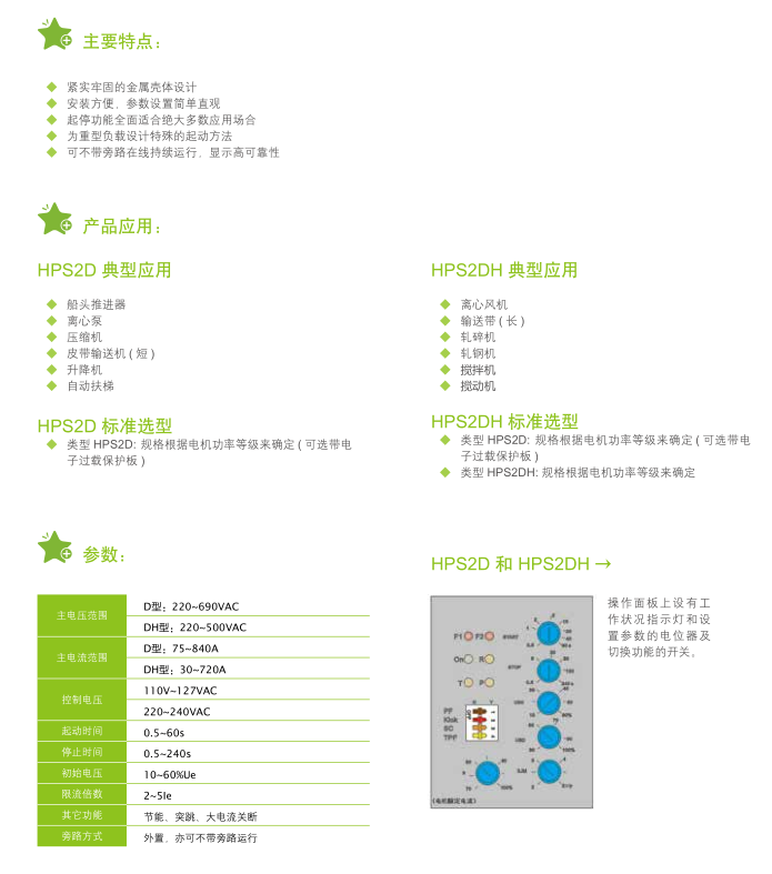 HPS2D75...840HPS2DH30...720 軟起動器均有著堅固的金屬殼體設計,可分別適用于常規(guī)負載和重型負載的各種應用場合它結構牢固緊湊,安裝方便快捷。所有參數(shù)和功能選項均通過前面板上的調節(jié)電位器和功能切換開關來設定和選擇。直觀清晰,各工作階段和狀態(tài)及故障均有相應LED 指示讓用戶一目了然。特設節(jié)能功能,當電機運行在空載或輕載時自動降低負載電壓,