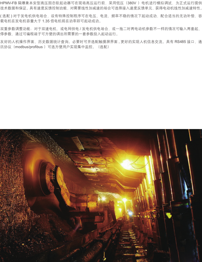 HPMV-FB系列礦用隔爆兼本質(zhì)安全型高壓交流軟起動器具有多種起動方式、控制功能和完善的電機綜合保護功能。消除了機械及電流沖擊,延長了設備使用壽命,提高礦用設備的穩(wěn)定性、安全性。主要適用于煤礦礦井下和其他周圍介質(zhì)中含有甲烷及煤塵混合物的爆炸性氣體及條件惡劣的特殊環(huán)境中。