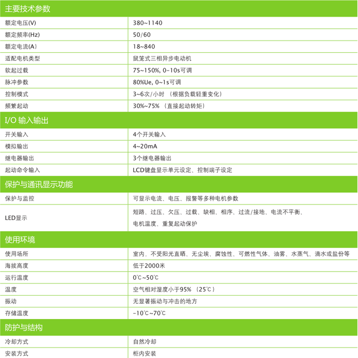 對電網(wǎng)及機械設備沖擊小等優(yōu)點,是傳統(tǒng)起動方式理想的更新?lián)Q代產品。適用于石油、冶金、礦山、選煤廠含有爆炸性氣體(甲烷)和煤塵的煤礦井下的重載或使用條件惡劣的三相異步電動機的軟起動、軟停車控制。