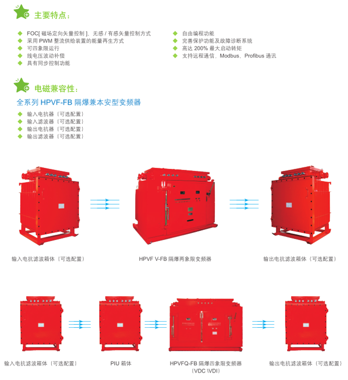 HPVF-FB隔爆兼本安型變頻器以全新的設計思路,將變頻、矢量控制、隔爆及本質安全等技術相結合,具有多種控制模式、低速高轉矩等特性,可四象限運行,具有能量回饋功能,節(jié)能效果明顯。主要適用于煤礦井下或露天礦山、選煤廠等有爆炸危險場所的大負荷設備軟起動、軟停車控制。
