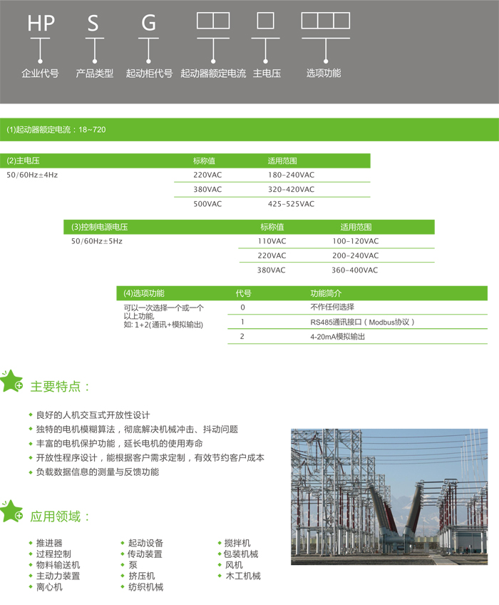 HPSG列通用型軟起動(dòng)控制柜是以先進(jìn)的智能化數(shù)字式電動(dòng)機(jī)軟起動(dòng)器為主要控制件并配有保護(hù)型主回路進(jìn)線斷路器、旁路接觸器于一體 ,可實(shí)現(xiàn)多重保護(hù)的單臺(tái)電機(jī)控制裝置。