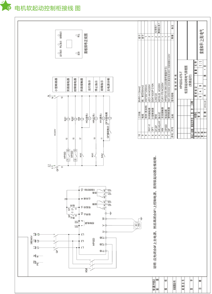 裝置內(nèi)置HPISD型軟起動(dòng)器,并設(shè)有起動(dòng),停止按扭及運(yùn)行、停止、故障指示。裝置內(nèi)留有遠(yuǎn)控接點(diǎn),遠(yuǎn)控接點(diǎn)有起動(dòng)、停止輸入接點(diǎn)、運(yùn)行指示輸出接點(diǎn)、故障輸出接點(diǎn)(均為無源繼電器接點(diǎn)。具有短路保護(hù)、過載保護(hù)、過熱保護(hù)、斷相保護(hù)及大電流斷開功能。選用其它型號(hào)控制件裝置的控制功能見相應(yīng)的軟起動(dòng)說明書。